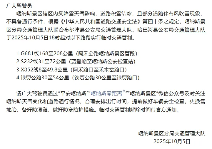 但在昨天(10月4日)与今天(10月5日),“平安喀纳斯”公众号又分别发布了交通管制信息。