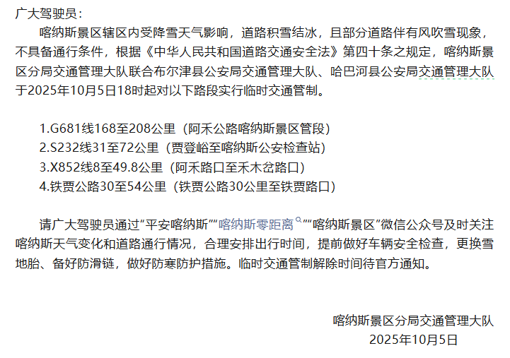 10月1日,“平安喀纳斯”公众号发布公告称,对部分路段进行交通管制,10月2日道路积雪已清理完毕,达到安全通行条件,2日10时30分已对景区部分路段解除交通管制。