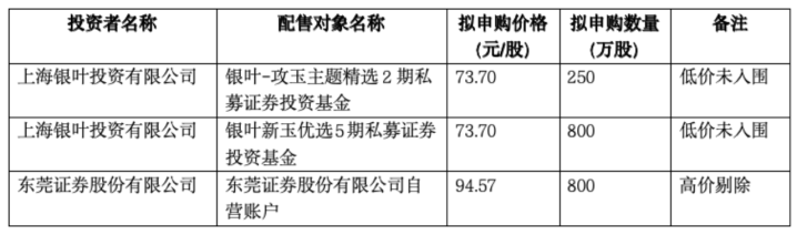 报价信息表显示,上海银叶投资有限公司管理的2只产品报出73.70元/股最低价,因为低价未入围;东莞证券股份有限公司自营账户报出94.57元/股最高价,被高价剔除。